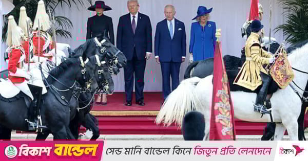 [ad_1] মার্কিন প্রেসিডেন্ট ডোনাল্ড ট্রাম্পকে রাজকীয় সংবর্ধনায় স্বাগত জানিয়েছে ব্রিটেন। বুধবার ব্রিটিশ রাজপ্রাসাদ উইন্ডসর ক্যাসলে পৌঁছালে লালগালিচা সংবর্ধনা, তোপধ্বনি ও অশ্বারোহী বাহিনীর প্রদর্শনীর মতো রাজকীয় আড়ম্বরের মধ্য দিয়ে সস্ত্রীক ট্রাম্পকে